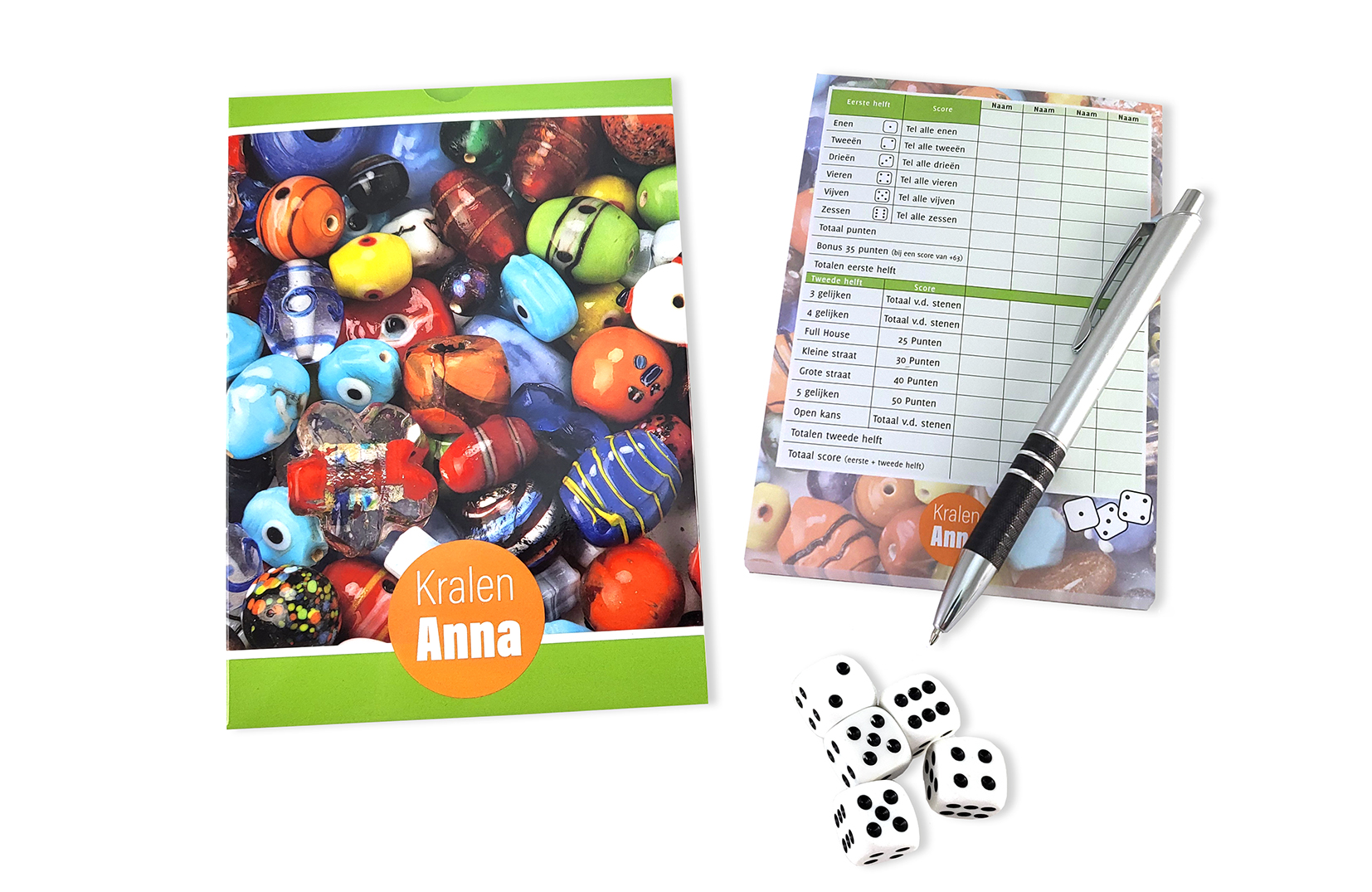 Om Yahtzee en soortgelijke populaire spellen mee te spelen. De promotionele doos en het scoreblok worden geheel naar wens in Full Colour bedrukt. De standaard pen is onbedrukt, maar wij kunnen, zonder kosten een pen, die bij ons door u wordt aangeleverd, bijvoegen.